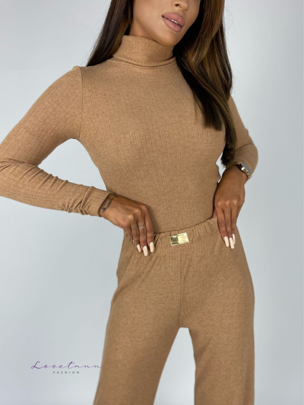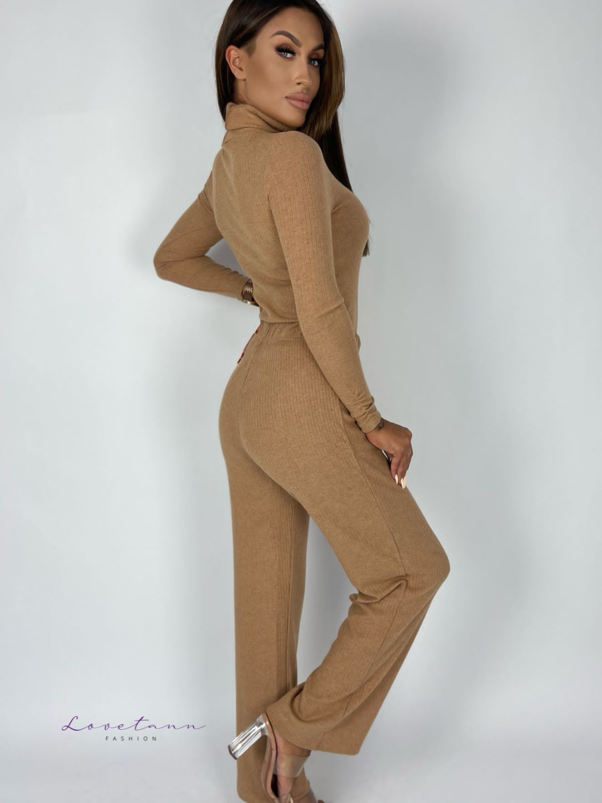 Zestaw z dzianiny sweterkowej Emma składa się z golfu i szerokich spodni w tym samym kolorze. Dzięki temu możemy stworzyć spójną stylizację, która nie tylko zapewni nam ciepło, ale także podkreśli nasz gust i poczucie mody.