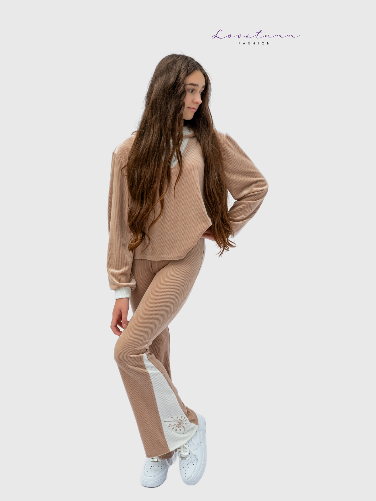 Subtelny, elegancki i wyjątkowo komfortowy ✨ Komplet welurowy prążkowany Lovetann w odcieniach beżu i ecru to idealna propozycja dla dziewczynek i nastolatek, które cenią modę w stonowanych barwach. Miękki materiał, nieuciskające wykończenia i retro fason spodni czynią go ulubionym zestawem do szkoły, na co dzień i na wyjątkowe okazje.