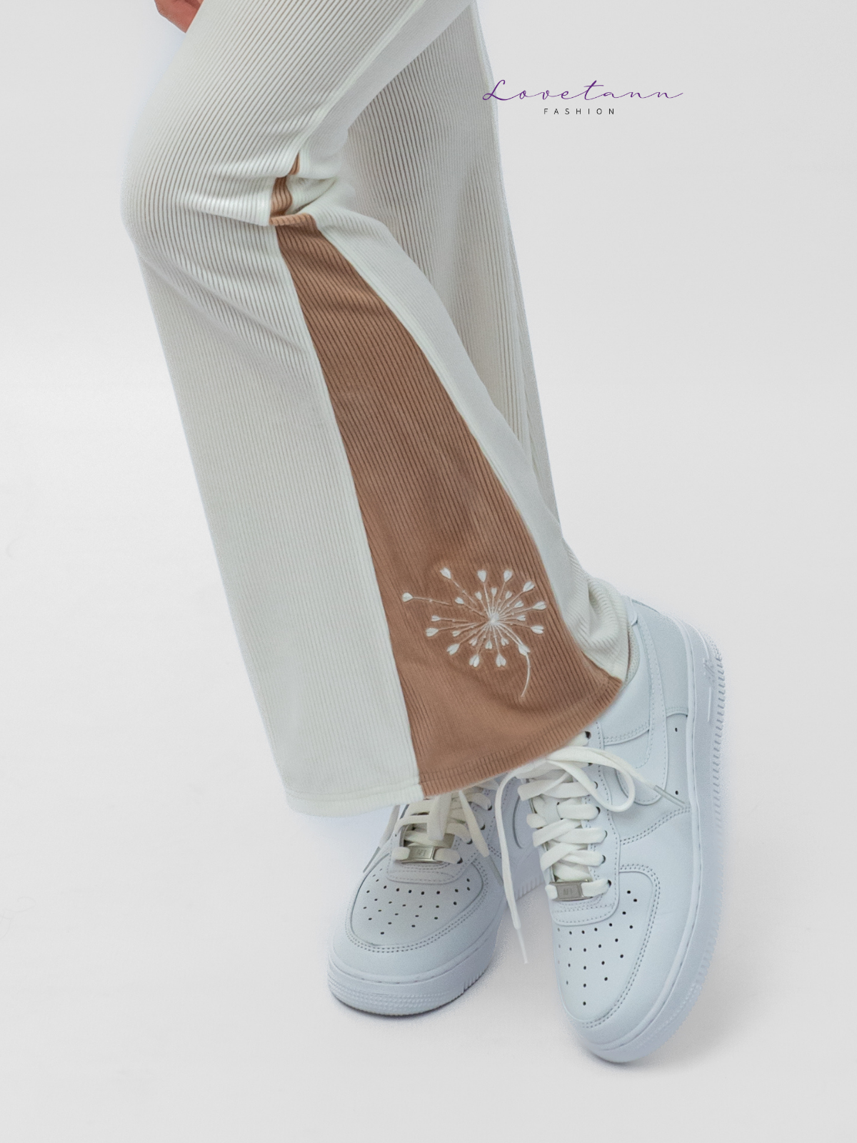 Z jasnymi sneakersami – monochromatyczny, delikatny look.