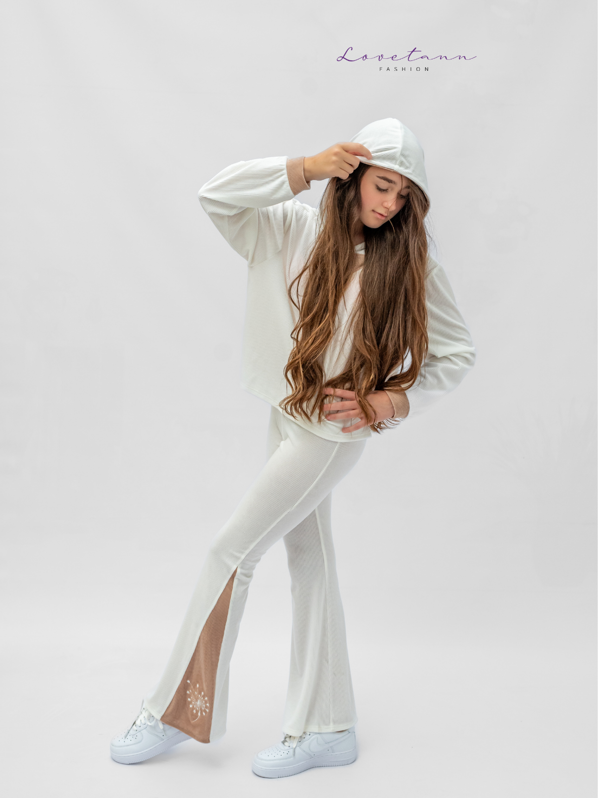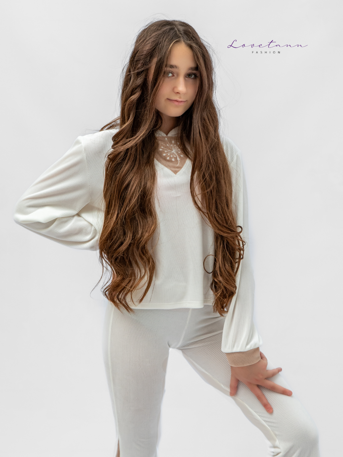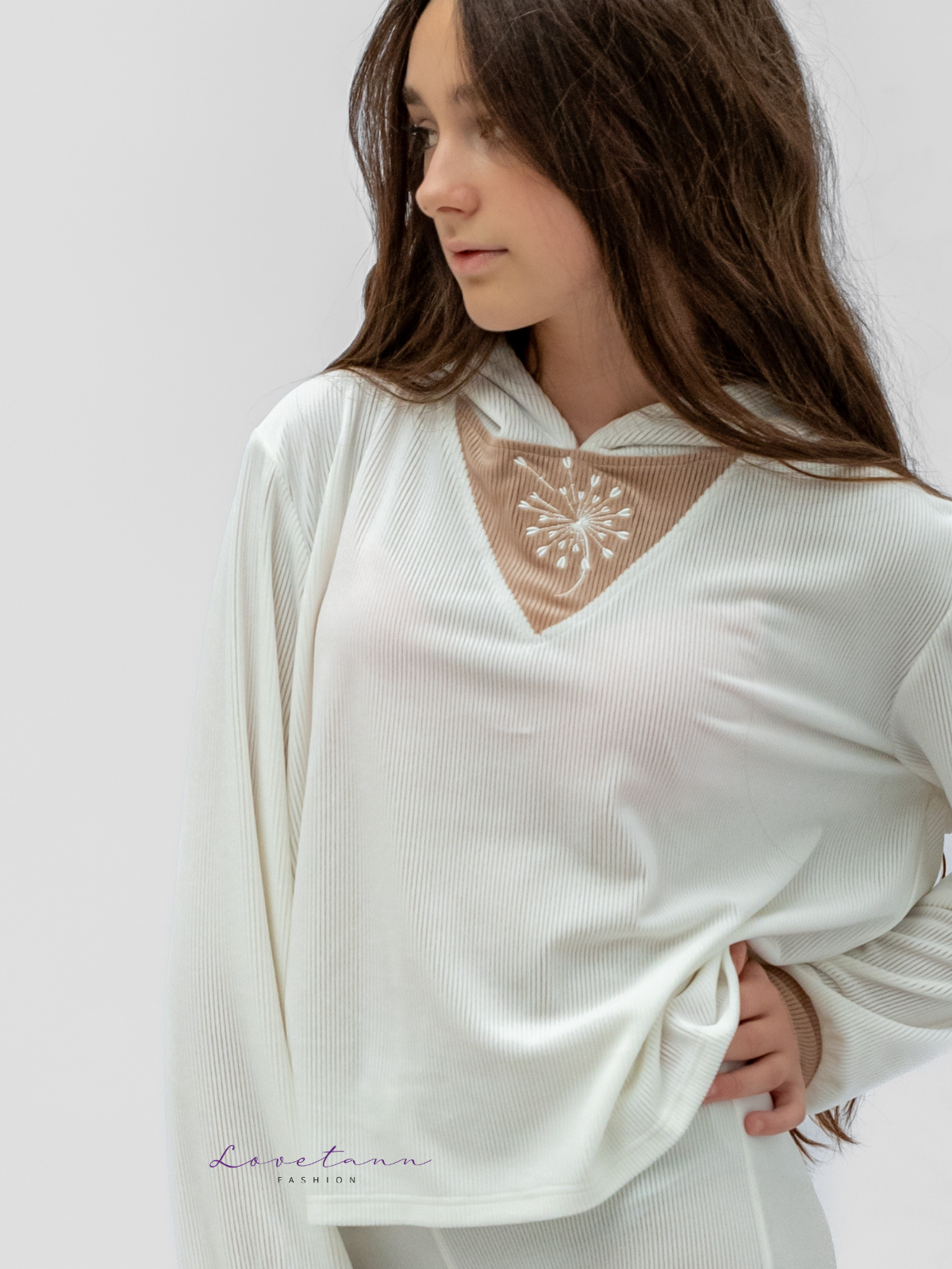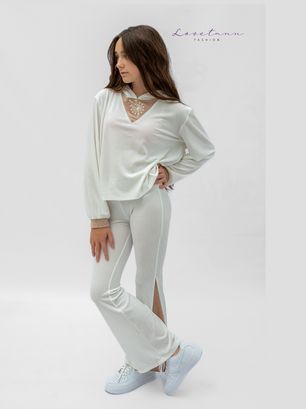 Delikatny, świeży i pełen elegancji ✨ Komplet welurowy prążkowany Lovetann w odcieniach ecru i beżu to propozycja dla dziewczynek, które lubią jasne stylizacje i naturalne barwy. Połączenie miękkiego weluru, kontrastowych wstawek i wygodnego kroju sprawia, że ten zestaw idealnie łączy komfort z ponadczasowym stylem.