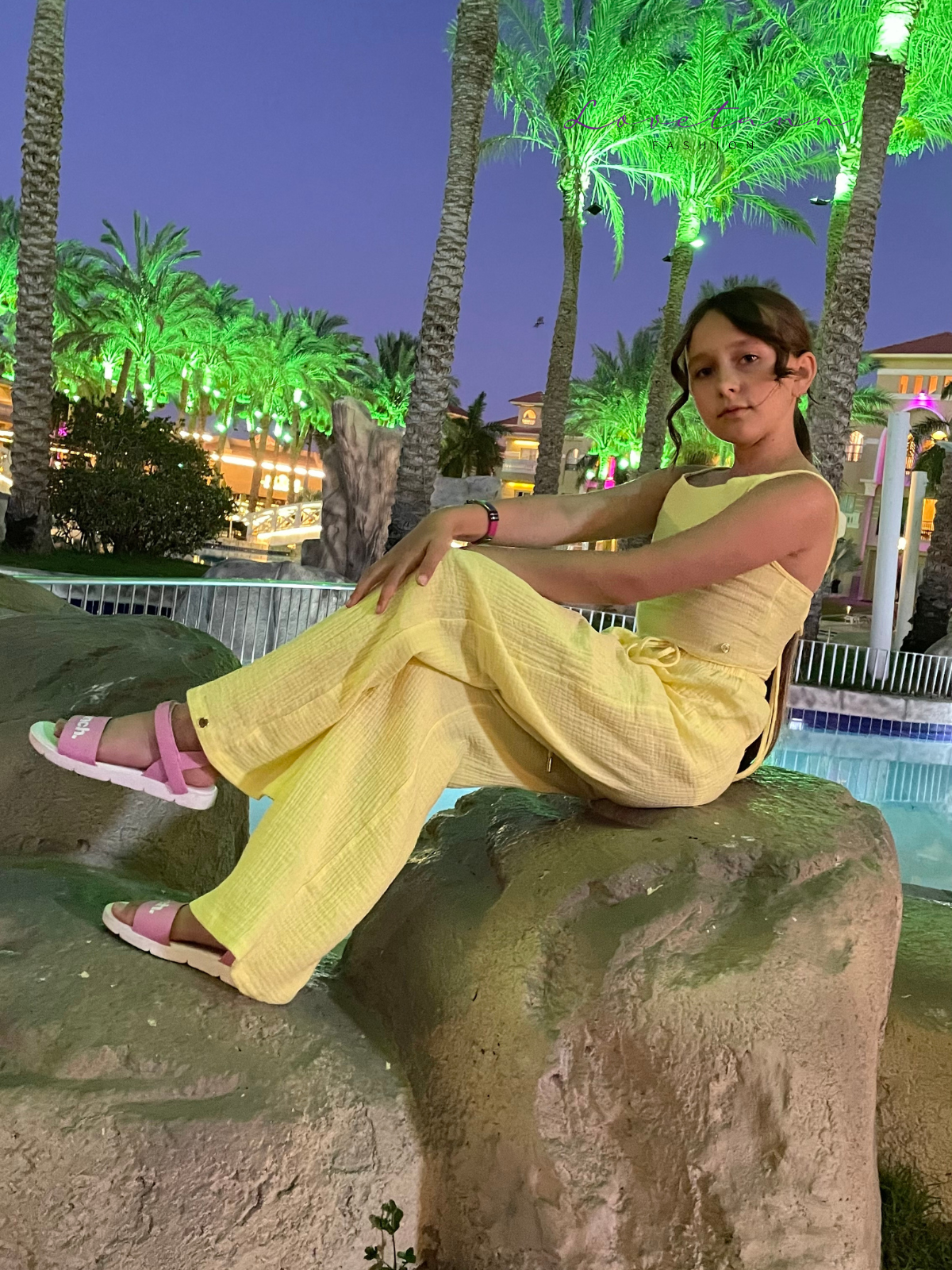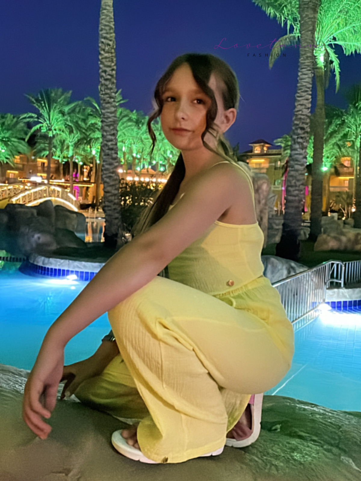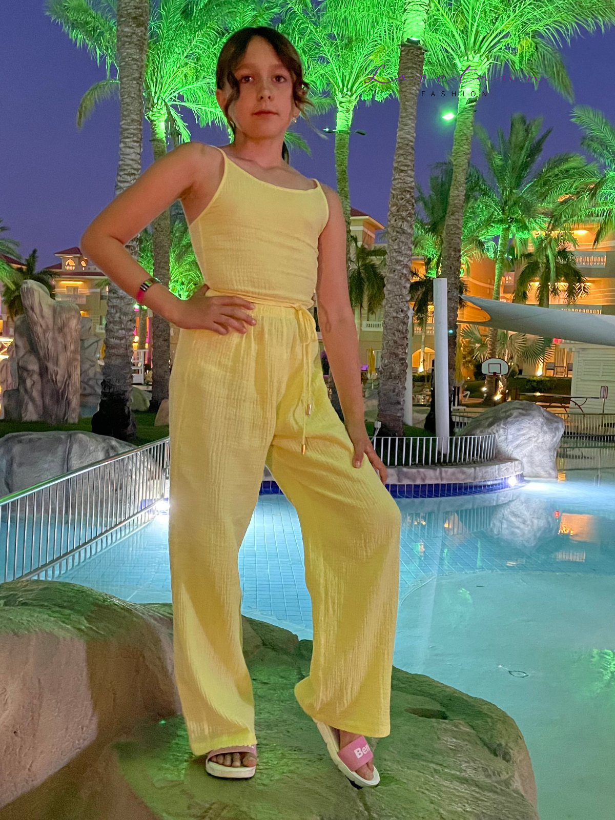 Holiday Yellow by Lovetann – letni komplet dla dziewczynki wykonany z wysokiej jakości muślinu bawełnianego, zapewniającego maksymalny komfort noszenia. Komplet składa się z dwóch części: szerokich spodni oraz sznurowanego crop topu. Polska produkcja.