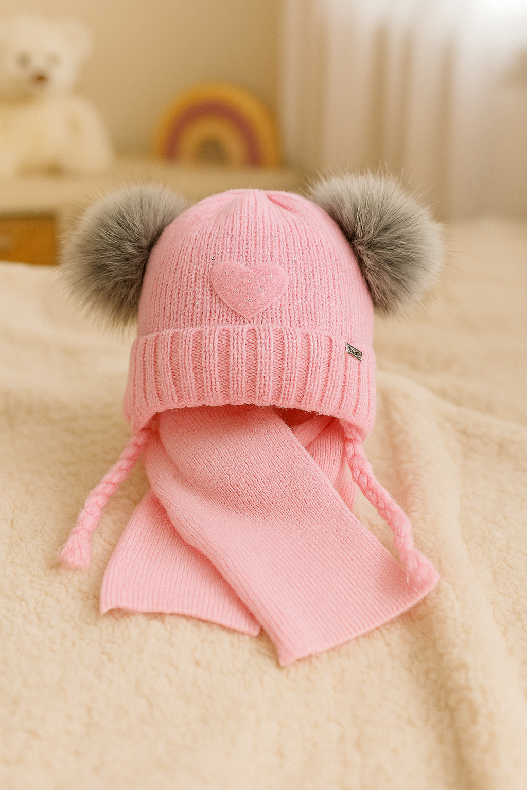 Ten komplet to kwintesencja słodkiego stylu i funkcjonalności. Czapka z dużymi, miękkimi pomponami z ekologicznego futerka i dopasowany szalik otulą Twojego maluszka w chłodne dni, zapewniając mu komfort i ciepło.