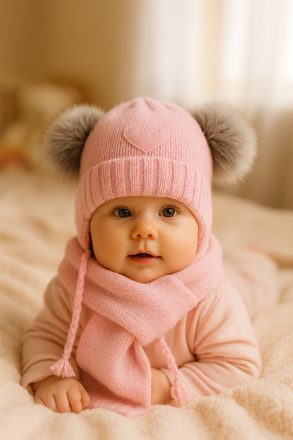Komplet niemowlęcy zimowy – czapka z futrzanymi pomponami + szalik Jasny RóżDostępność: Na stanie