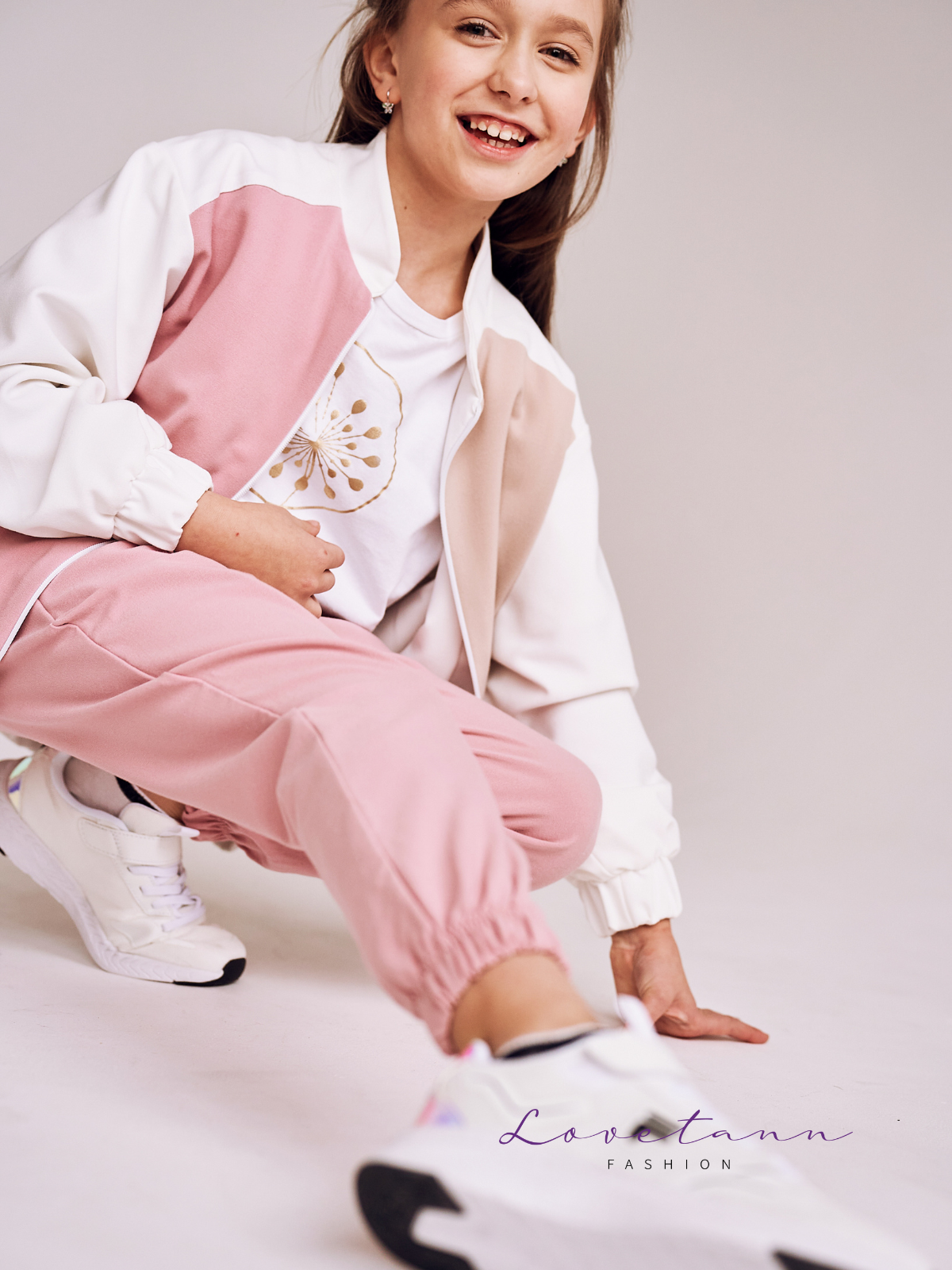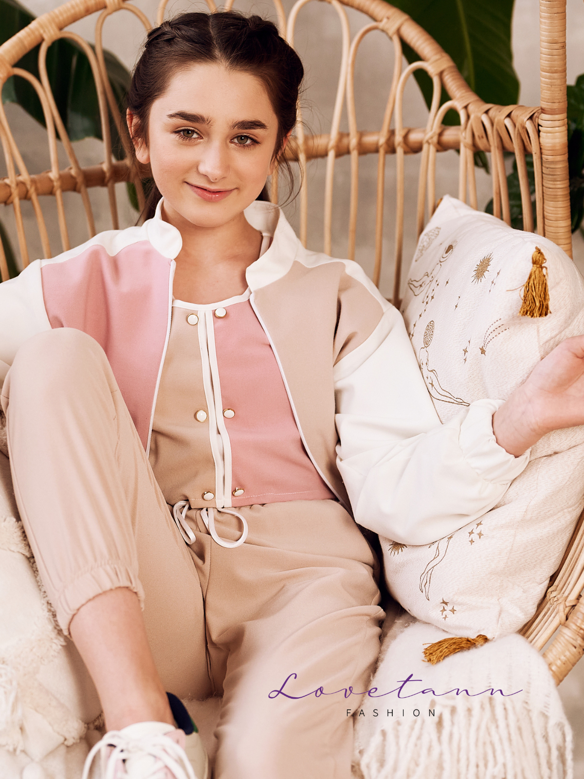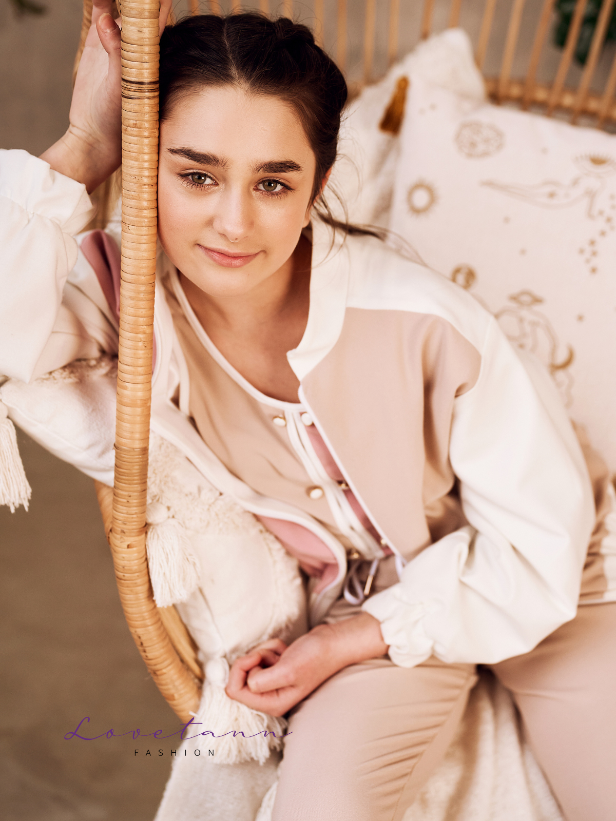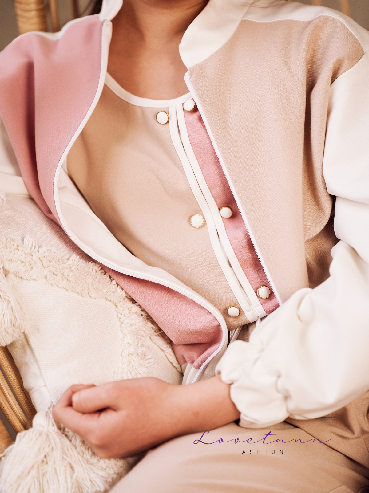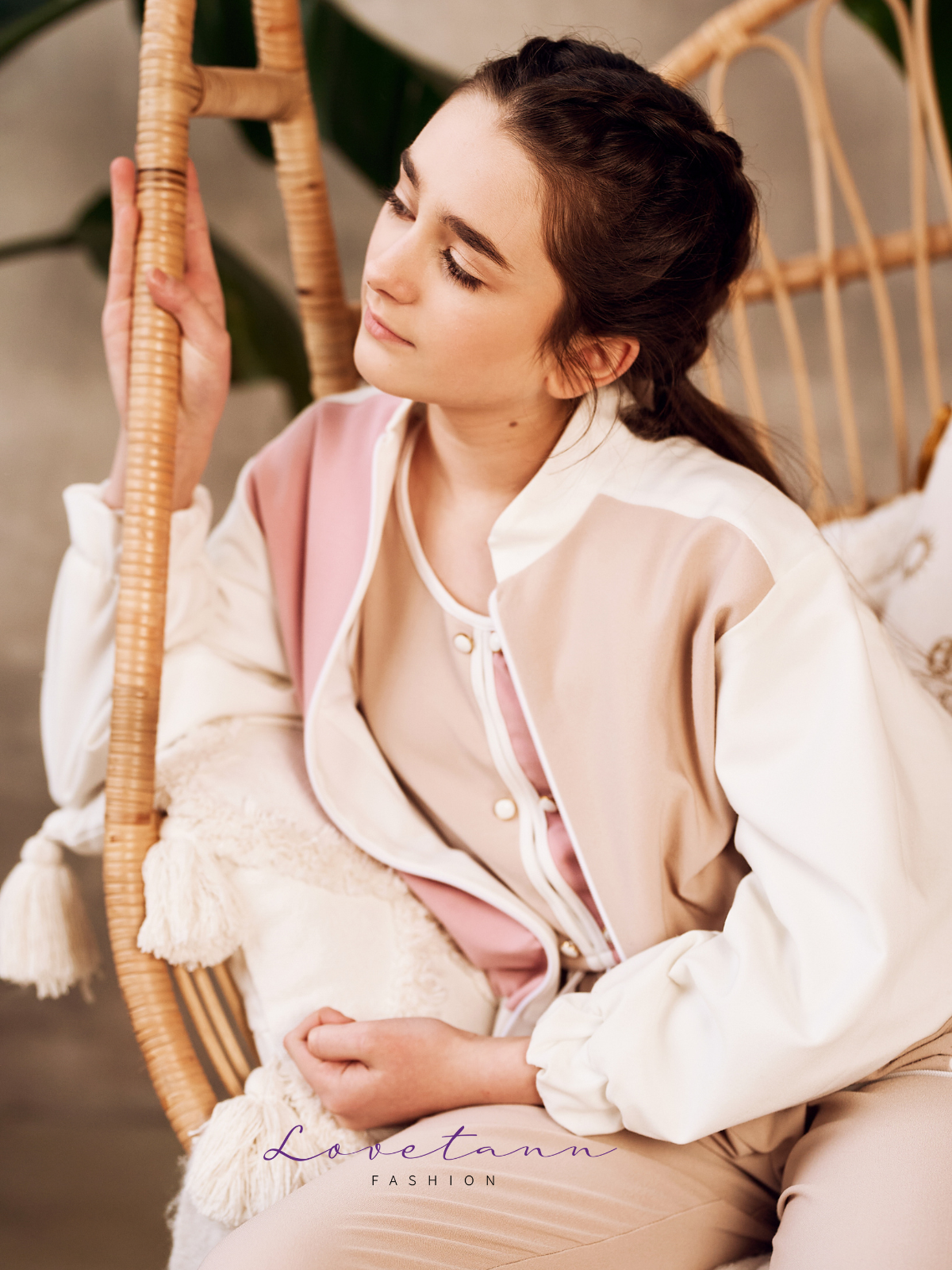 Jest to kurtka wykonana z miłego materiału, z dużą zawartością wiskozy (ponad 30%), z trzech ładnie współgrających ze sobą kolorów. na mięciutkiej, jasnej podszewce. Stójeczka dodaje charakteru. Guma w pasie i w mankietach ułatwia ładne ułożenie kurteczki.